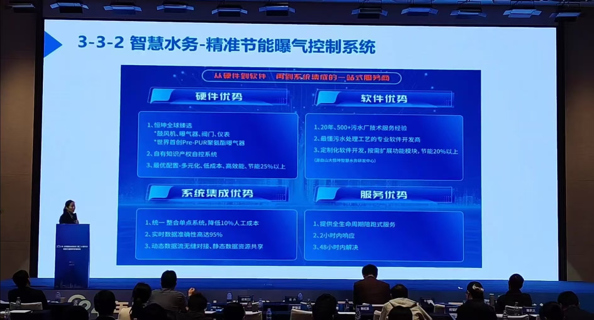 司曼女士指出,目前行业存在智慧水务产业化程度不高、产品标准化有待提高、业务创新原生动力不足、急需产品到平台的思维转型等行业现状。本次演讲分析了智慧水务发展的痛点与难点及智慧水务实际应用中所存在的问题,并为污水处理厂提供了一套由软硬件相结合的整体解决方案—HK-PRO-ENERGY™精准节能曝气控制系统。这套系统是基于先进的数据分析和软件算法,并充分融合了数据智能和云控制等前沿技术,能够以更低的成本来使污水处理的控制过程更加精准,节能,高效,并使数字化治污得到了实现,让污水处理厂能够实现精细化运营,将污水处理控制技术提升到了一个全新的水平。